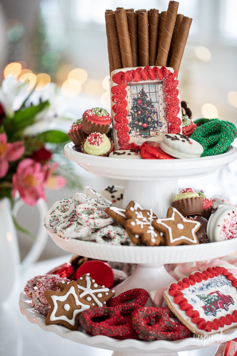 Again, I’m not sure if this classifies as decor, but I wanted to include this idea on this list. I recently shared a tour of my kitchen decorated for Christmas and one of my displays was this stunning tiered tray (which I made out of cake stands) full of sweet treats and cookies. As you can see, a few of my gingerbread cookies made the display.