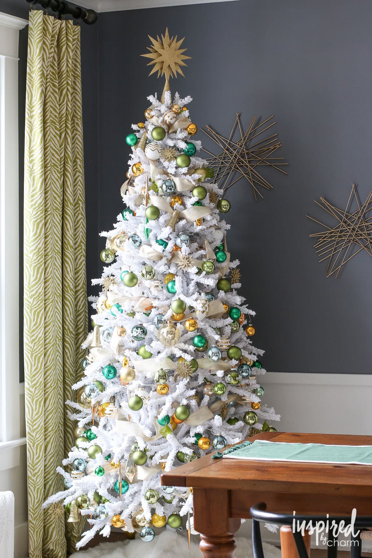 I’m not a big fan of white trees, but yours is beautiful. I love the greens and golds you chose for the bulbs.