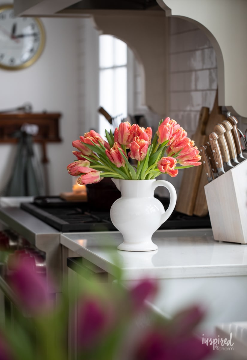 While I’ve shared several flower arranging tips here (be sure to check out my ultimate flower arranging guide) on Inspired by Charm, I thought it might be helpful to create a post dedicated to tulips. They have some different requirements when it comes to arranging, so I put together all I know and I am happy to share it with you.